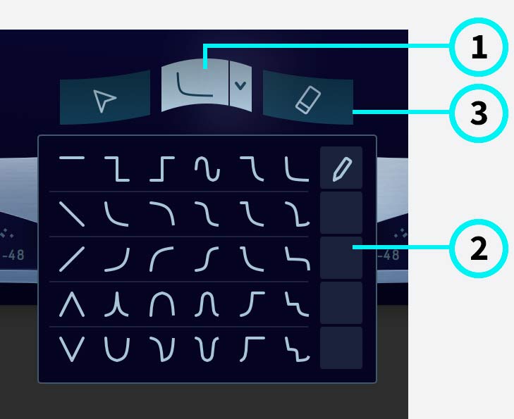 ① Paint Tool – The Paint Tool allows you to draw envelopes based on a number of available preset shapes. Each shape contains an arrangement of several nodes.