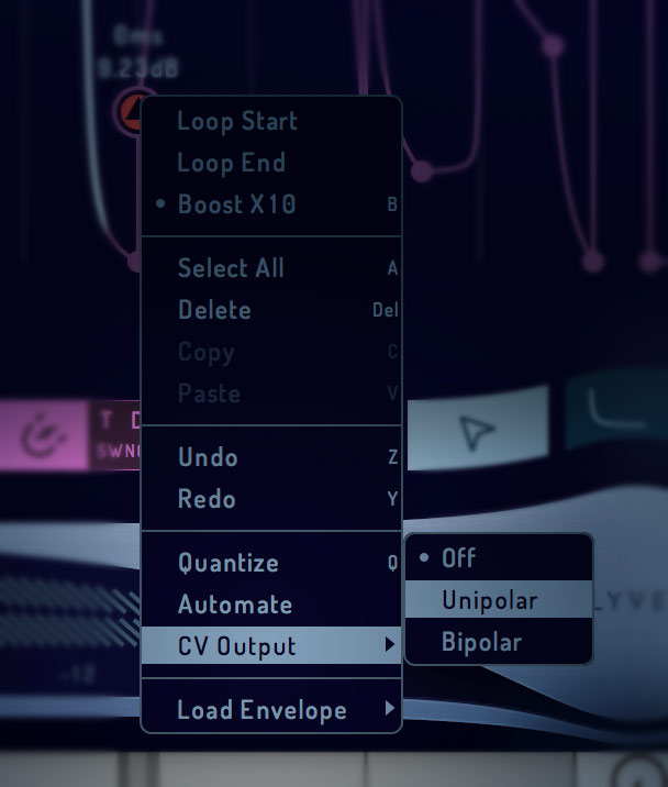This provides a Control Voltage output that can be used to control external synthesizers, specifically modular synthesizers. Hook it up to your Eurorack for some of the most elaborate envelope generators available today! To enable CV, right click on a node or any space on the Grid.