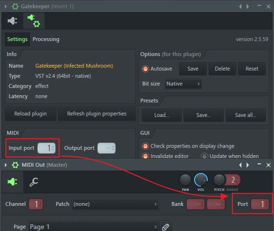 - Set the Gatekeeper MIDI input port to 1 as well