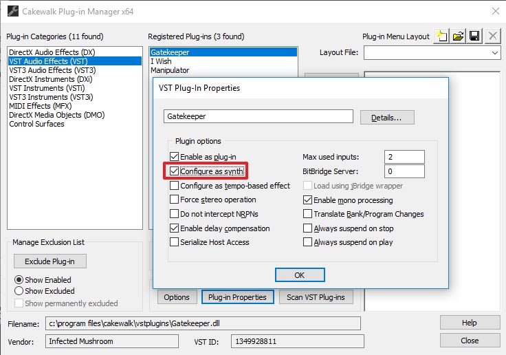 - Configure Gatekeeper as a synth in “Cakewalk Plug-in Manager”
