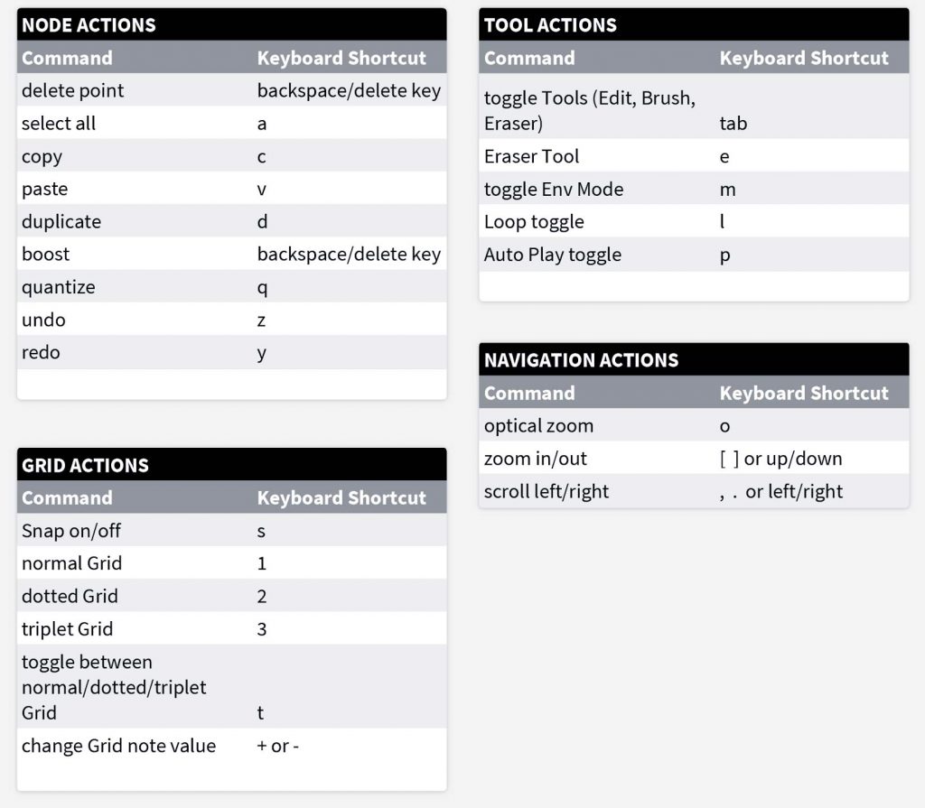 | Zoom In / Out | Use the mouse wheel Right click on the background of the envelope and drag up/down (this provides a stepped zoom in/out so you can keep your scrolling position easily)Use shortcuts: “[“ and “]” or “↑” and “↓” |