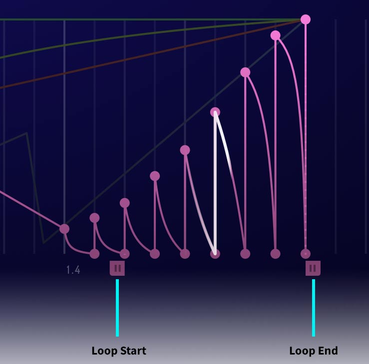 ③ Sustain Loop – allows you to set an internal loop within the envelope as defined by the Loop Start and Loop End points. These Start and End points can only exist on a node. To define the loop start and end points, simply right-click on a node and select “Loop Start” or “Loop End”. You can also easily drag the handles of the loop markers to your desired nodes. Loop start and end nodes will snap to the same amplitude when moved to avoid clicks.