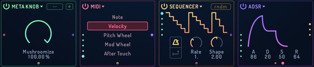Four slots are available, each of which can hold one of the five modulation sources: Meta Knob, MIDI, Sequencer, Follower and ADSR.