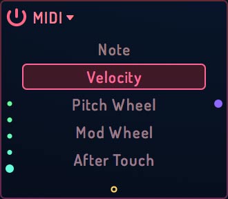 Velocity: a unipolar value from 0 to 1, representing the velocity of incoming MIDI notes