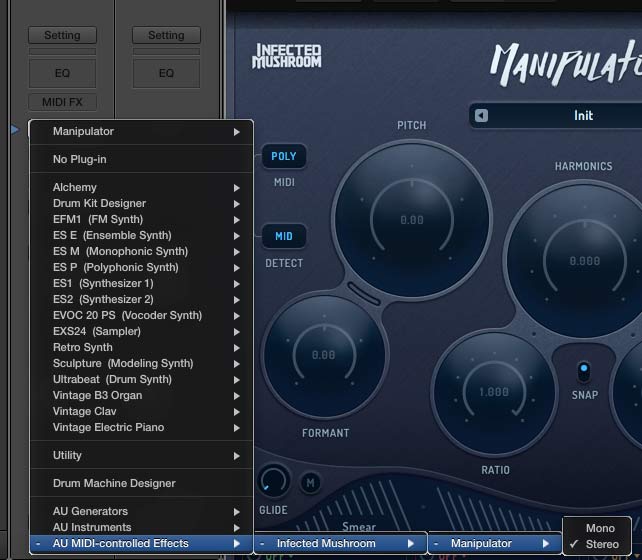 Manipulator can be inserted into audio or instrument tracks just like any audio effect. However, some of its features involve responding to MIDI notes and MIDI CC messages.