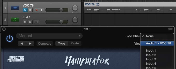 - Open the Manipulator plugin interface. In the top right, select your sidechain input to be the same as the audio track.