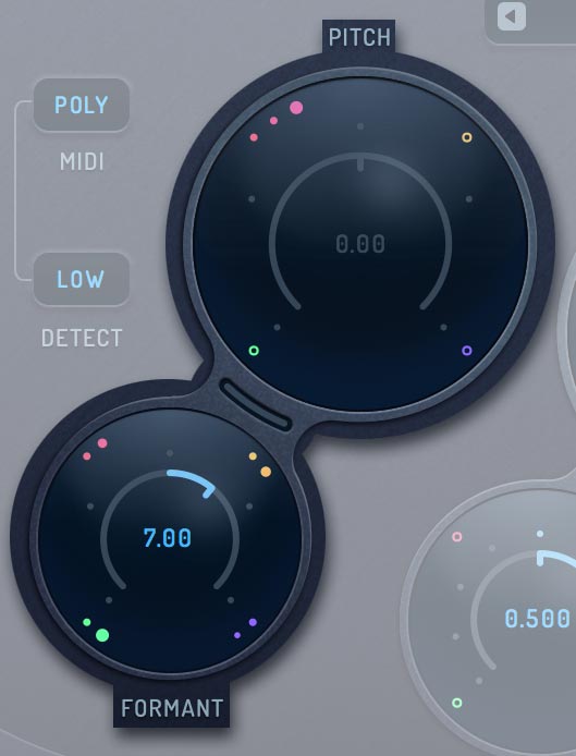 is a micro-slider located between the Pitch and Formant knobs. Smooth Grains fills the gaps that form between grains when the pitch is being shifted down, resulting in a smoother-sounding pitch shift.