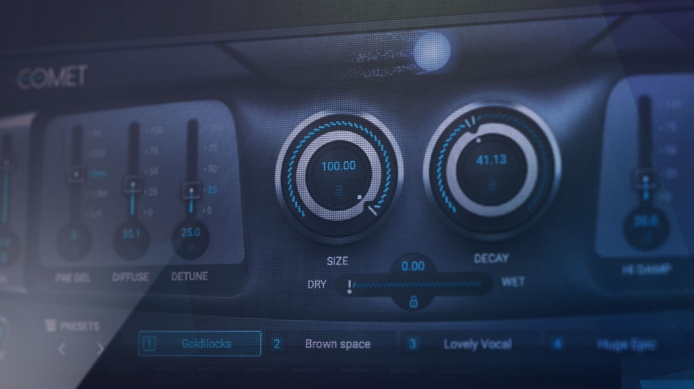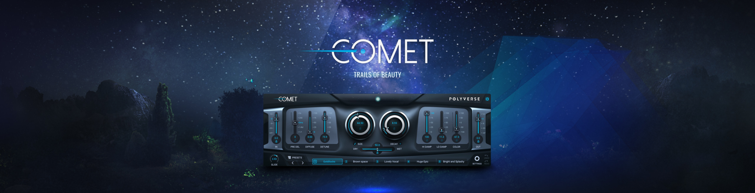 Comet is best designed for creating beautiful trails of sound. It does not aspire to model the physics of a room. Instead, it captures the essence of a beautiful reverb. Elevate your vocals to glow within your mixes. Polish your melodic instruments to shine with the lush richness of Comet’s quality. Breathe even more life into your music by using Comet to add unique textures to your ambient sound effects.